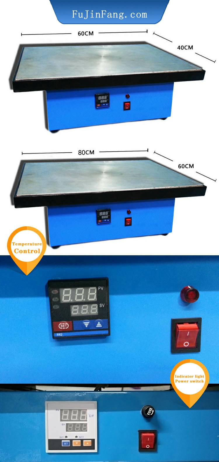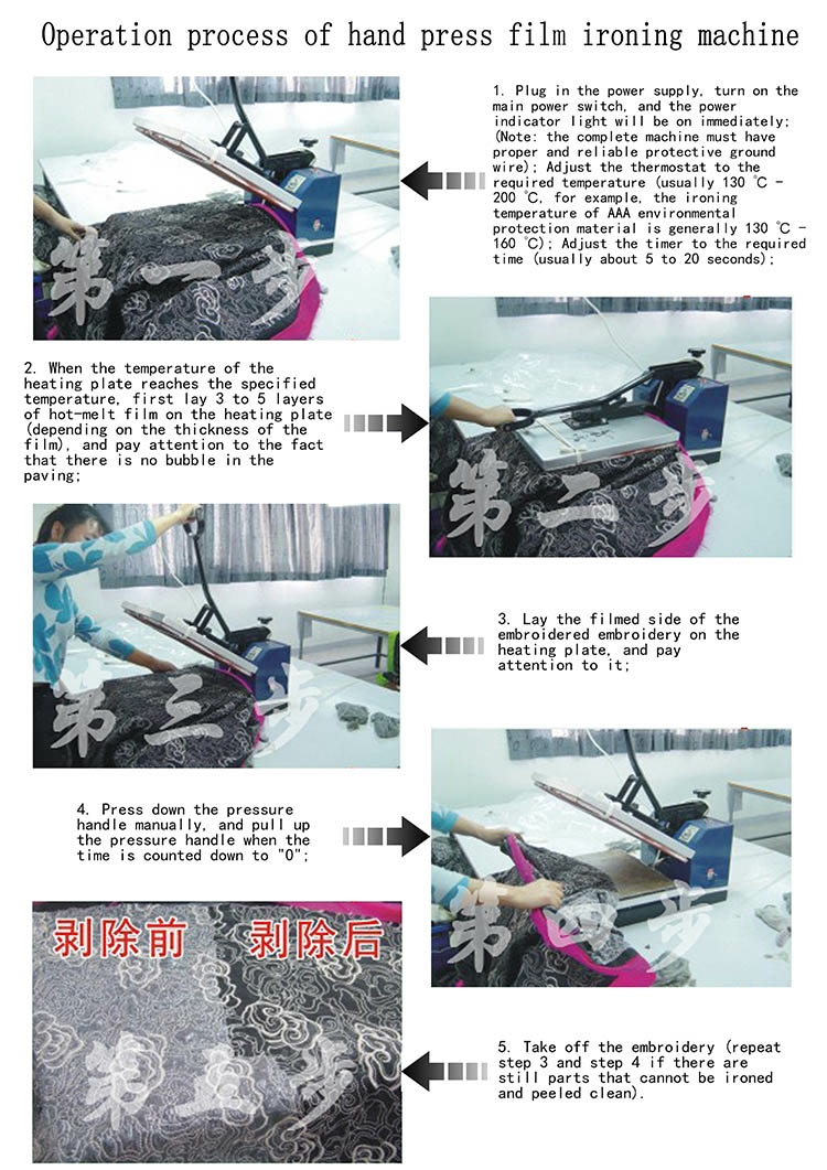 This is a hot melt adhesive equipment for post-processing of embroidery. Its working principle is that the hot melt adhesive film on the embroidery will be automatically pressed on the heating plate (flat plate) through the heated heating plate (flat plate), so that the embroidery will be clean and free of residue. It has the function of embroidering material, film and glue, saving electricity and durability, adjustable pressure (air pressure and hand pressure), numerical control constant temperature, and the temperature error of the heating plate is within 1 degree. This machine is simple in design, simple in operation, clean in stripping, efficient in production, and can effectively ensure that the fabric will not shrink, discolor, shrink, and discolor.
