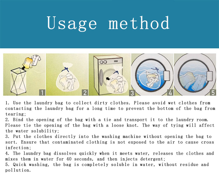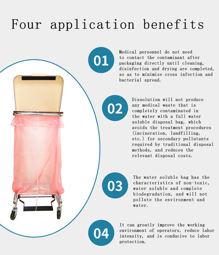 The main feature of the water soluble anti-infective medical fabric disposal bag (anti-infective medical laundry bag) is to prevent cross infection. Because the clothes collection bag made of the traditional PE bag is not soluble in water, the staff need to take the dirty goods (possibly contaminated with viruses, bacteria and chemicals) out of the PE bag by hand and put them into the washing machine, which is easy to be infected. The special laundry bag of the Infection Department of PVOH Hospital can be dissolved in water above 40 ℃, The "fabric anti-infective water-soluble bag" can be directly put into the washing machine, which is not easy to be infected and reduces the risk of infection for operators. Anti-infection treatment products of water-soluble fabrics in the hospital infection department include special laundry bags (fabric anti-infection water-soluble bags), anti-infection fabric collection vehicles and water-soluble quantitative washing/disinfectant packaging products, etc. The products are mainly used for packaging, disinfection, washing of a large number of reusable fabrics with potential biological or chemical pollution risks generated in the daily work process of the hospital infection department or workplace with occupational hazards, It can greatly reduce the pollution and spread of viruses, bacteria and chemicals, reduce the risk of cross contamination between operators, patients and pollutants, effectively reduce the harm to personnel and the working environment, and apply water-soluble anti-infective fabric anti-infective treatment products to treat and package the reusable fabrics in the infection department of the hospital or in the workplace with occupational disease hazards.