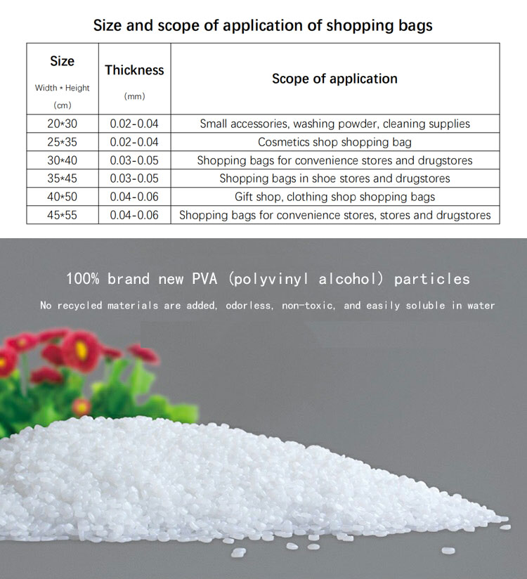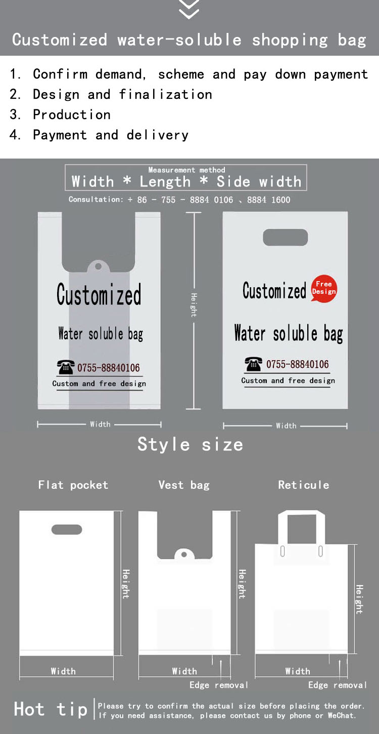 PVA water-soluble shopping bag is generally used for one-time packaging in supermarkets, pharmacies, convenience stores and other shopping places. Its performance will not decline within four hours after it is filled with warm water or ice-water mixture. Completely dissolved in medium-high temperature water (55 ℃ - 85 ℃), it is different from ordinary disposable shopping bags. It has the characteristics of environmental protection, easy dissolution, safety, non-toxic, oil resistance and corrosion resistance, static electricity prevention, elastic tension, air permeability and oxygen resistance, clear printing, and high anti-counterfeiting. It has passed the SGS certification monitoring, and can be printed in single or double colors at present.