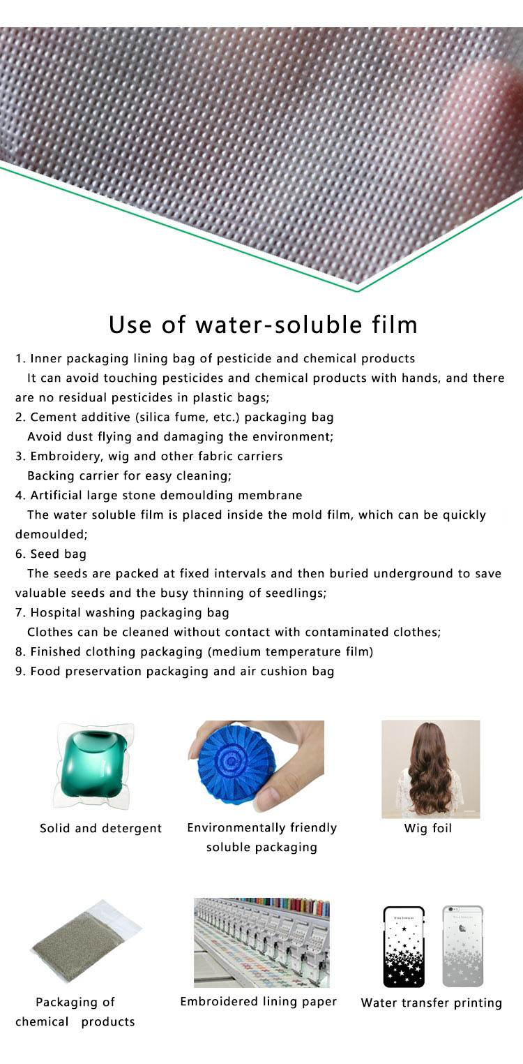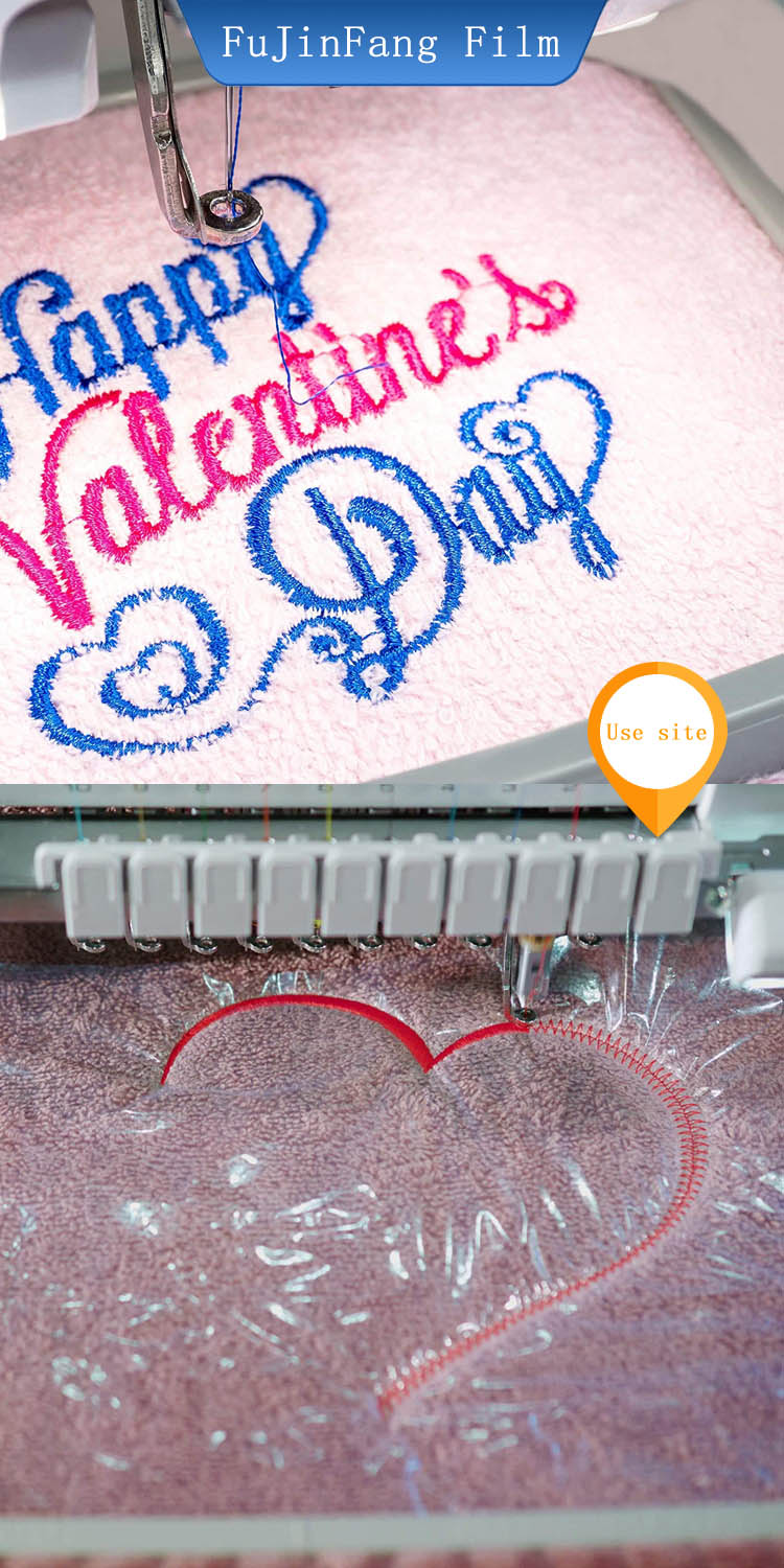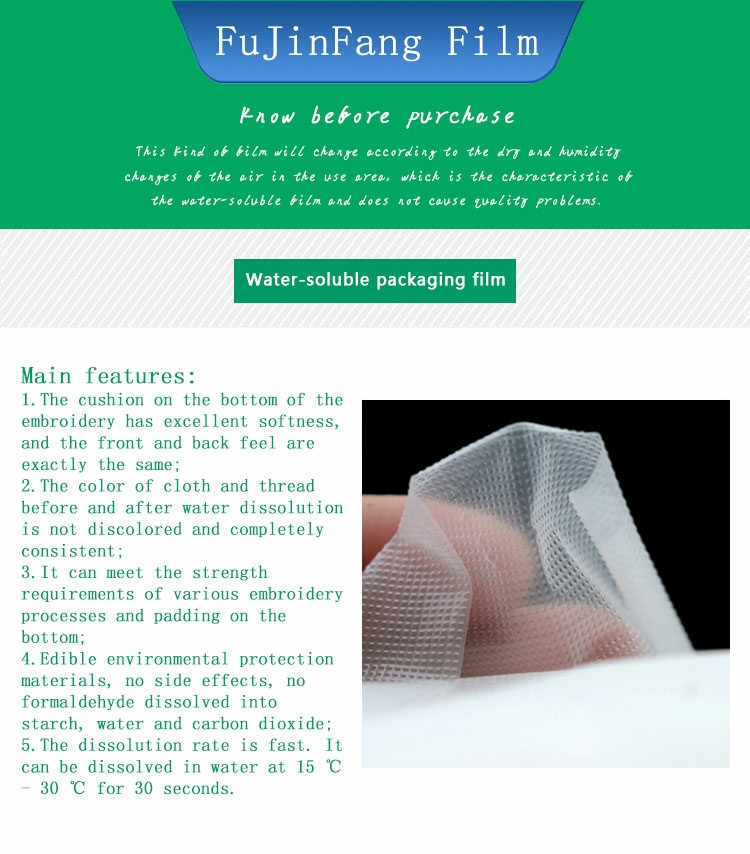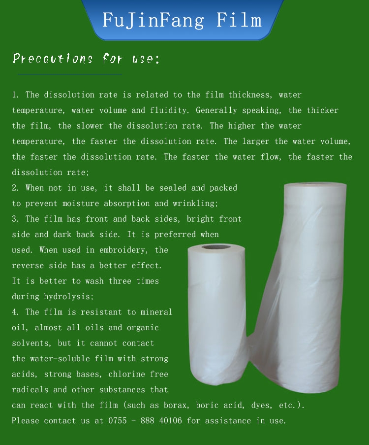 Embroidery hydrosol is a kind of quick-soluble tap water soluble film used by embroidery machine. This film can be dissolved in 30 seconds under normal temperature (15 ℃ - 30 ℃) water (if the water volume is large and the fluidity is good and faster). It can be thoroughly dissolved in 2 minutes. There is no residue on the embroidery and no harmful substances are produced. It can be used as a good product for table cloth embroidery, lace, mesh cloth and leather cloth. It has almost completely replaced the traditional hot-boiled high-temperature water soluble paper lining. After hot-boiled, the finished embroidery product is easy to wrinkle, which makes some products discolor, time-consuming and ugly. It is more convenient than the traditional hot-boiled water soluble paper lining, and it can completely dissolve and clean at room temperature, and can greatly improve the quality rate of embroidery products.